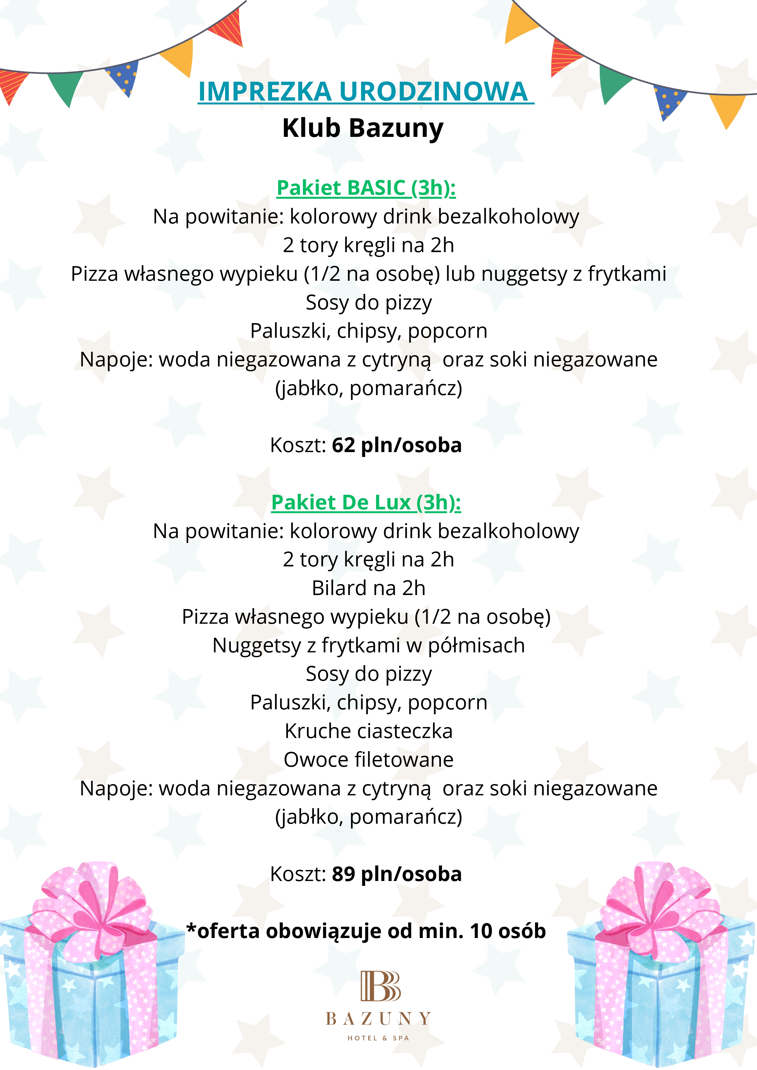 Wasze dziecko jest już za małe na plac zabaw, ale jednak zbyt duże na urodzinową dyskotekę? Jest na to sposób! Imprezka Urodzinowa w Klubie Bazuny z kręglami i przekąskami. Proszę zerknąć i wybrać pakiet :)