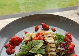 Sałatka z grillowanym serem Halloumi / salsa truskawkowa / kolorowy mix sałat z kremem balsamicznym