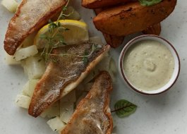Filet z okonia / potrawka z kalarepy / ziemniaki opiekane / majonez kaparowy