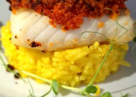 Polędwica z dorsza pod kruszonką z chorizo* / risotto cytrynowe / olej cytrynowy