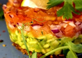 Wegański tatar z avocado / oliwa ziołowa / pomidor / cebula czerwona / kolendra / pumpernikiel